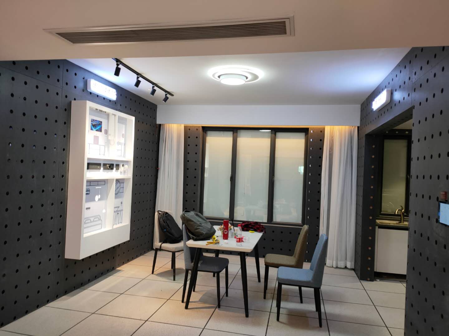 整個(gè)展廳的墻面設(shè)計(jì)采用灰色水泥板,水泥板沖孔成洞洞板,便于走線(xiàn),因?yàn)橹悄芗揖诱箯d要布很多電線(xiàn)網(wǎng)線(xiàn),并且后續(xù)有產(chǎn)品更新還會(huì)隨時(shí)上新產(chǎn)品,所以做成洞洞板形式便于識(shí)別并且走線(xiàn)。